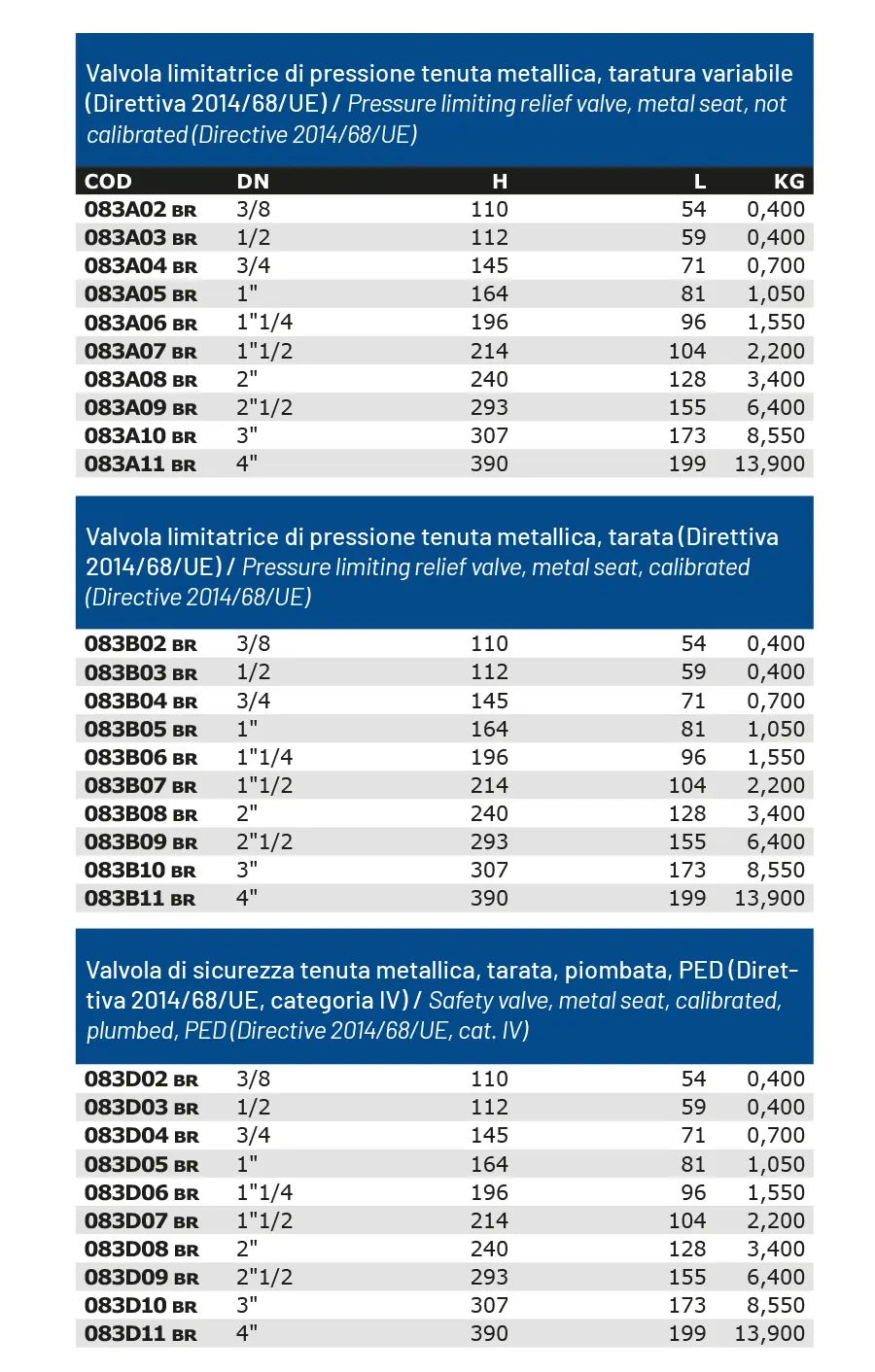 Valvole limitatrici di pressione/sicurezza in bronzo a normale alzata adatte per applicazioni a medie pressioni e temperature per acqua-aria-vapore e liquidi in genere. Su richiesta disponibile con cappuccio.