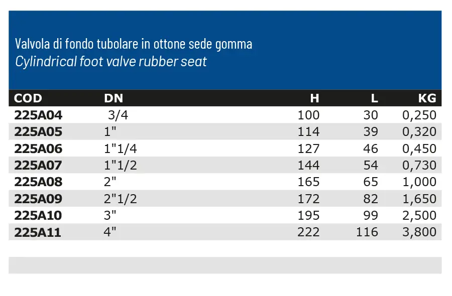 Valvola di fondo tubolare in ottone sede gomma